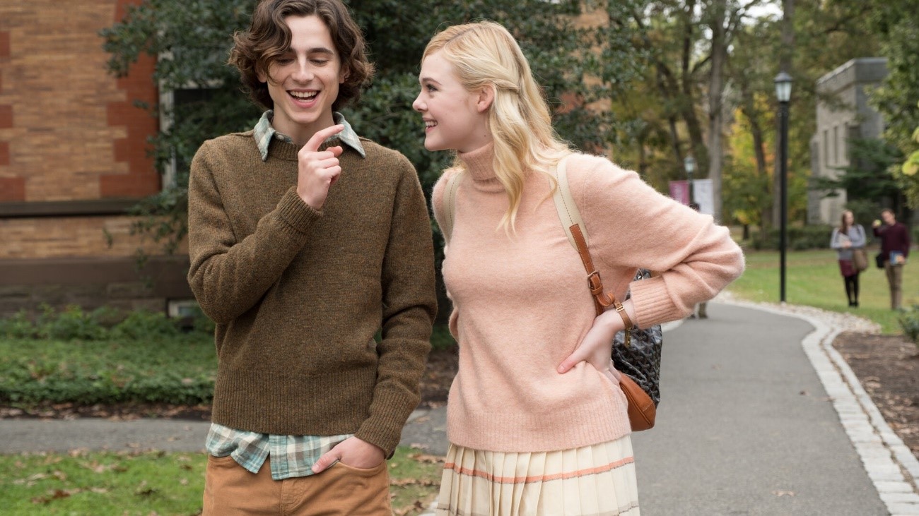 Allen compone una historia fresca con protagonistas jóvenes, lo que le sirve para reflexionar a la perfección sobre el paso de la adolescencia a la edad adulta, un viaje tanto de autodescubrimiento como de descubrimiento propio de la vida y sus entresijos, de las relaciones entre las personas, del transcurso del tiempo… Da verdadero gusto volver a tener a Allen “en su salsa”, cargando su película de diálogos rápidos -para un servidor muchos momentos serían dignos de una verdadera screwball– y tremendamente graciosos sin olvidar los temas reflexivos que suele tratar en su obra; todo ello gracias a una Elle Fanning en estado de gracia y un Chalamet que recuerda a aquellos personajes misteriosos cargados de dramas y reflexiones internas.