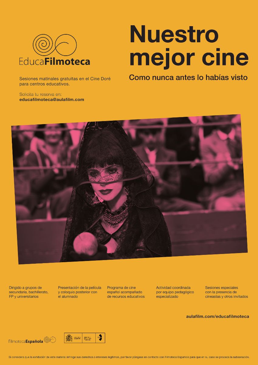 EducaFilmoteca se dirige especialmente a estudiantes de 12 a 18 años, en un intento de divulgar entre los jóvenes el patrimonio cinematográfico español a través de un recorrido por títulos representativos de distintos lenguajes, épocas y géneros. Su programación está compuesta por títulos comoAguaespejo granadino (Val del Omar, 1955), El bosque animado (José Luis Cuerda, 1987), Blancanieves (Pablo Berger, 2012) o Verano 1993 (Carla Simón, 2017). Todas las sesiones se acompañan de contenidos pedagógicos que facilitan el trabajo de los docentes antes y después del visionado. Además, las proyecciones siempre se completan con coloquios dinamizados por el equipo de mediación de EducaFilmoteca, acompañados en ocasiones por invitados especiales relacionados con el equipo técnico y artístico de cada film.Los centros educativos interesados en asistir a las matinales gratuitas los próximos meses de noviembre, diciembre, enero y febrero pueden tramitar ya sus reservas a través de este formulario: bit.ly/reservaeducafilmoteca. Las plazas se cubrirán por estricto orden de solicitud hasta completar el aforo.