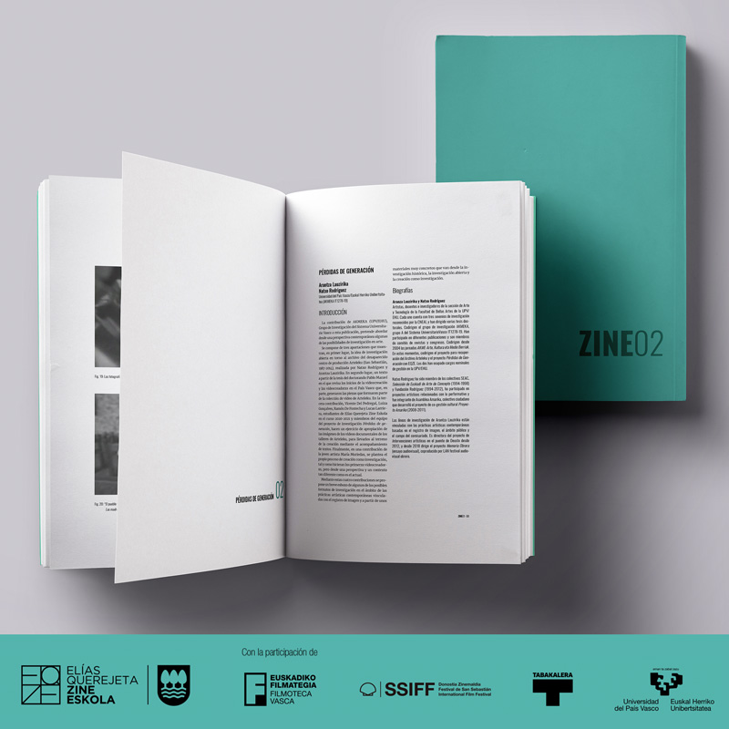Por otra parte, y como resultado del proyecto de investigación Pérdidas de generación de Elías Querejeta Zine Eskola (EQZE), ZINE publica un dossier dedicado a la investigación abierta en torno a la colección de vídeo del desaparecido centro de producción artística Arteleku (Donostia, 1987-2014), creado por la Diputación de Gipuzkoa. Esta sección cuenta con las aportaciones de Arantza Lauzirika y Natxo Rodríguez, artistas, docentes e investigadores de la sección de Arte y Tecnología de la Facultad de Bellas Artes de la UPV/EHU y codirectores del grupo de investigación AKMEKA; Pablo Maraví, graduado en Comunicación Audiovisual y doctorando del programa Investigación en Arte Contemporáneo de la Facultad de Bellas Artes de la UPV/EHU; Vicente del Pedregal, Luiza Gonçalves, Ramón De Fontecha y Lucas Larriera, estudiantes de la tercera promoción de EQZE e integrantes del equipo del proyecto de investigación;y de la artista María Muriedas. En su conjunto, el dossier propone un esbozo sobre algunos de los posibles formatos de investigación en el ámbito de las prácticas artísticas contemporáneas vinculadas con el archivo, el video y la imagen digital.