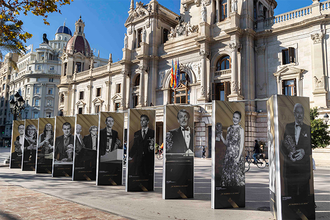 Los Premios Goya también toman las calles. La Plaza del Ayuntamiento es el marco en el que se exhiben fotografías de gran formato de valencianos y valencianas o de personas con un estrecho vínculo con esta Comunidad que han recibido un Premio Goya.