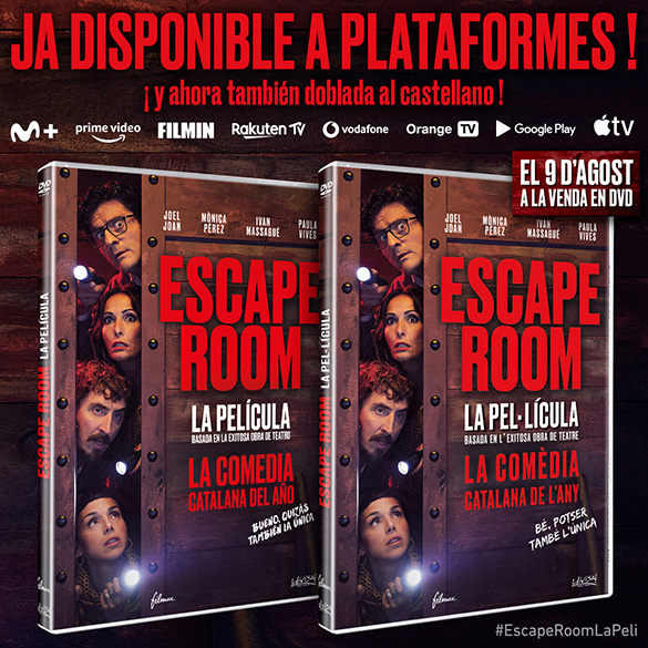 “ESCAPE ROOM: LA PELÍCULA” ya está disponible en plataformas online y saldrá a la venta el próximo 9 de agosto en DVD, tanto en la edición original en catalán como en la versión doblada al castellano. Después de cuatro temporadas de éxito en el teatro, con más de 200.000 espectadores, la comedia escrita por Joel Joan y Hèctor Claramunt saltó recientemente a la gran pantalla con Joel Joan (El nom), Paula Vives (Nit i dia), Ivan Massagué (El hoyo, Benvinguts a la família) y Mònica Pérez (Polònia) como protagonistas del filme.
