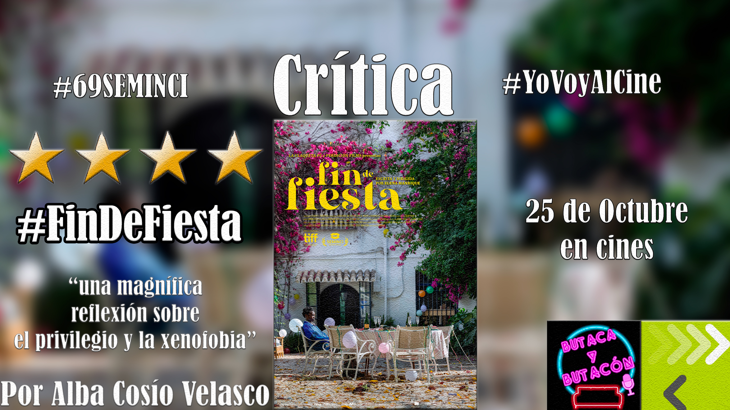 Escrita y dirigida por Elena Manrique, ‘Fin de fiesta’ es una irónica crítica al paternalismo que se muestra en nuestro país cuando se trata de hablar de inmigración. A través de unos personajes bien definidos y una trama tan delirante como verosímil, crea un relato incómodo de ver, pero necesario de contar y reflexionar.