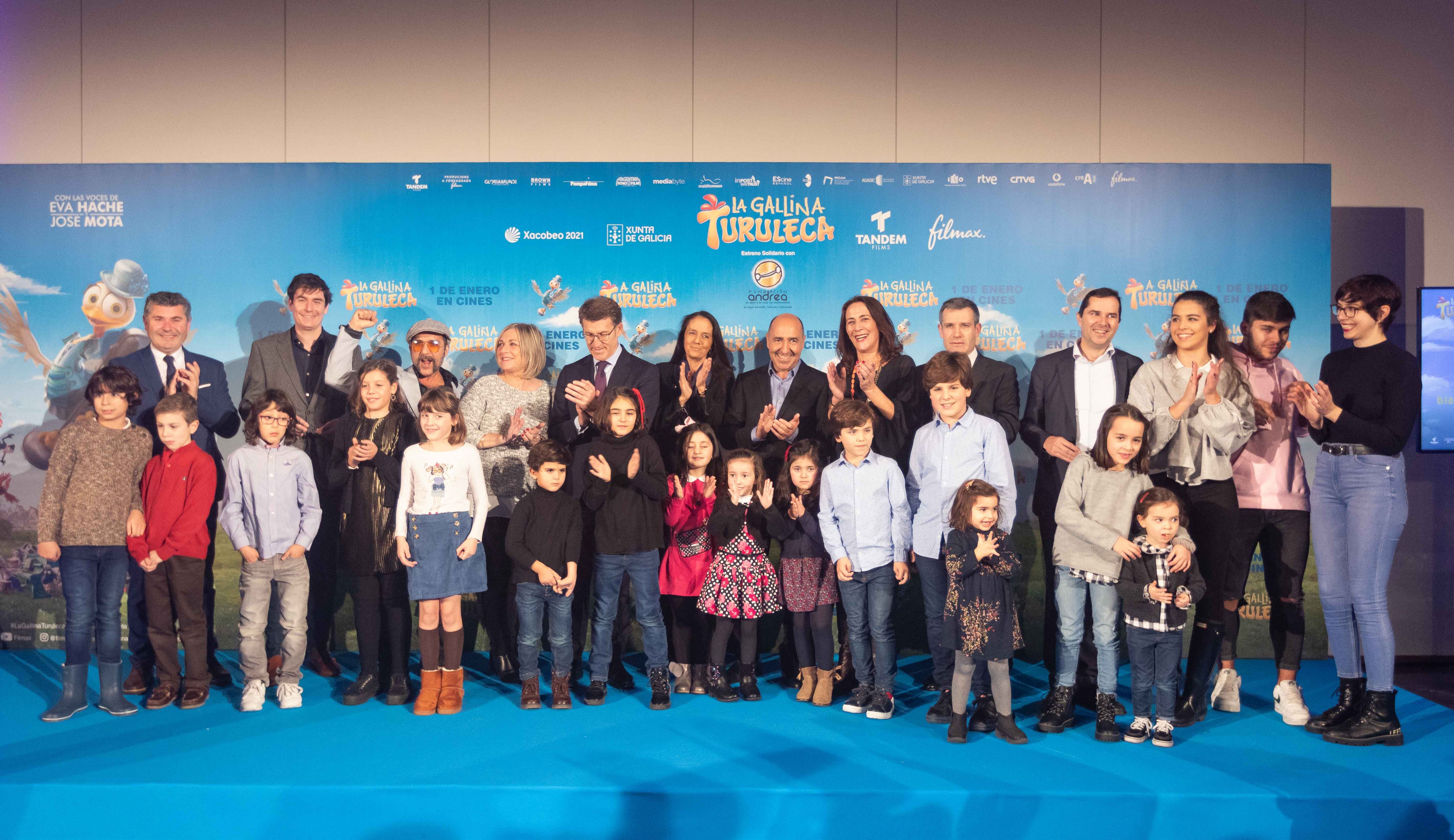 Filmax y La Xunta de Galicia, con la colaboración de la Fundación Andrea, presentaron en la tarde de hoy jueves en el Palacio de Congresos de Santiago de Compostela, la première solidaria de LA GALLINA TURULECA a la que acudieron 1.500 niñ@s de aldeas rurales de Galicia sin cines como Triacastela, Rábade, A Fonsagrada, Calo, Pontedeume, Muros, Noia, Comarca del Deza.